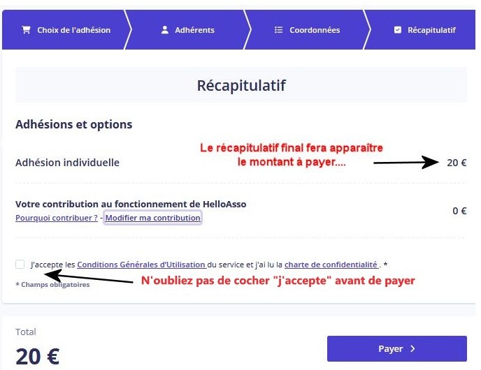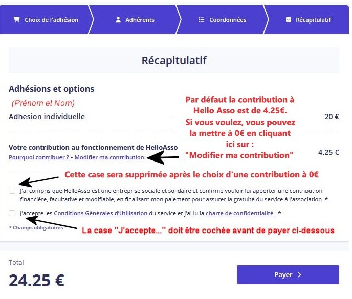 Si vous ne le souhaitez pas, décochez la case de soutien pour indiquer la valeur 0 € (voir plus bas conseils pour payer par CB)