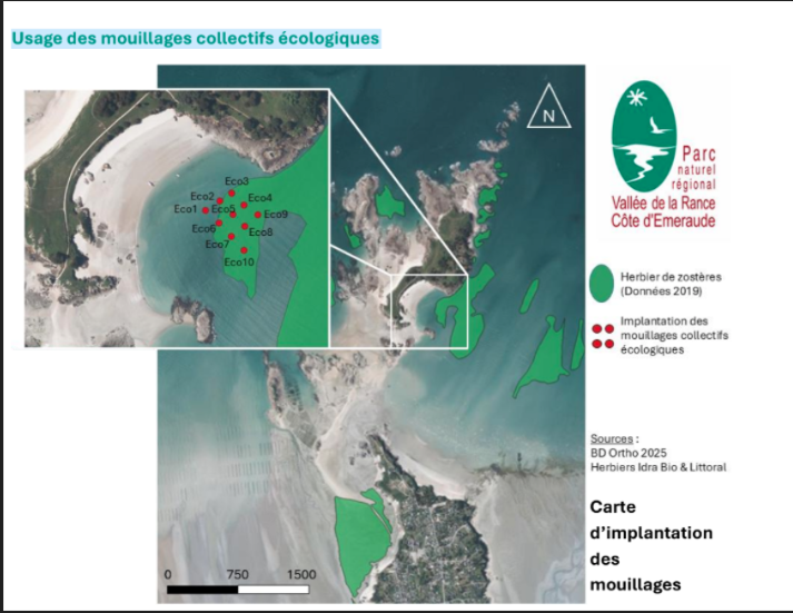 L’ancrage régulier des navires de plaisance mettent une forte pression sur les zostères marines. C’est pour les préserver et favoriser leur développement que des mouillages écologiques collectifs ont été installés devant la plage de la Chapelle sur l’archipel des Ebihens, au sein du Parc naturel régional Vallée de la Rance-Côte d’Emeraude. Ces mouillages écologiques collectifs « ont vocation à concilier les usages – la plaisance en l’occurrence, et la préservation de la biodiversité », comme le précise le document de présentation du Parc naturel et de la commune.