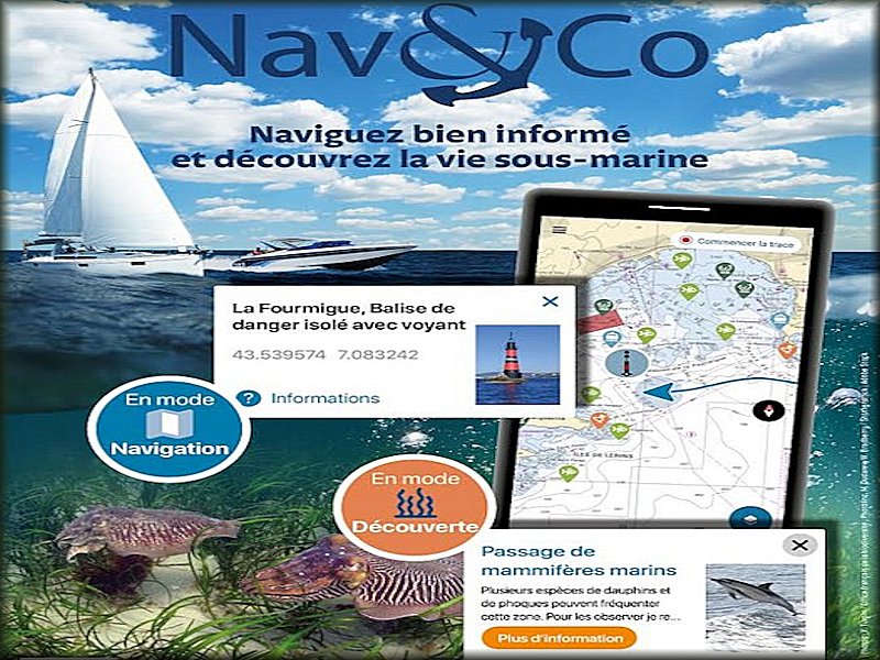 | Nav&Co c’est le plaisir de découvrir les cartes marines du Shom avec de nouvelles fonctions interactives. Le balisage gagne en interactivité et donne accès à des photos facilitant l'identification des amers. En plus de la réglementation de sécurité maritime indiquée sur la carte, le navigateur est averti par des notifications quand il traverse une aire marine protégée ou une zone soumise à une réglementation environnementale particulière (interdiction de débarquer ou de naviguer pour respecter la tranquillité de la faune). De retour au port un carnet de navigation permet d'enregistrer son parcours pour préparer de prochaines escapades.Au fil de sa navigation, les informations viennent directement s’afficher sur l’écran de l’utilisateur pour l’informer des restrictions et des zones sensibles au mouillage. Le mode découverte donne de nombreuses informations ludiques et pédagogiques sur la biodiversité marine. | ||