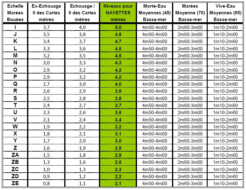Ainsi, par la combinaison de la valeur d'une ligne (ZE à I) et de la lecture du marégramme de la journée souhaitée, on peut facilement déterminer les plages horaires d’accessibilité de la navette à son bateau.