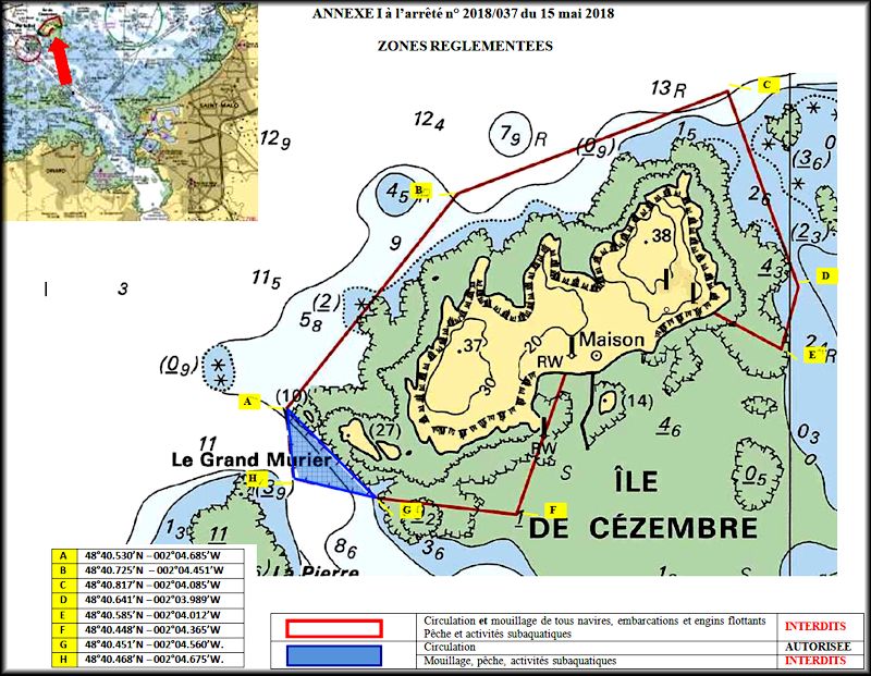- L’ancienne zône réglementée au SUD de l’île a été modifiée permettant d’agrandir la zône des mouillages (alignement E modifié "48°40.585’N" – "002°04.012’W")