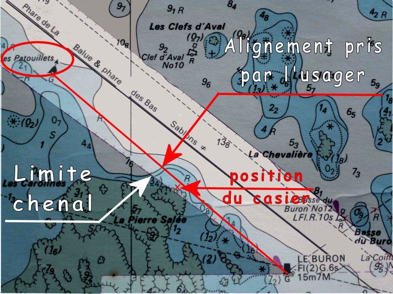 La carte ci-contre indique la position du casier. De bonne foi, le pêcheur avait pris comme limite l’alignement entre le Buron et la bouée des Patouillets. Or le chenal est délimité par l’alignement entre le Buron et Le Sou, soit légèrement en retrait !